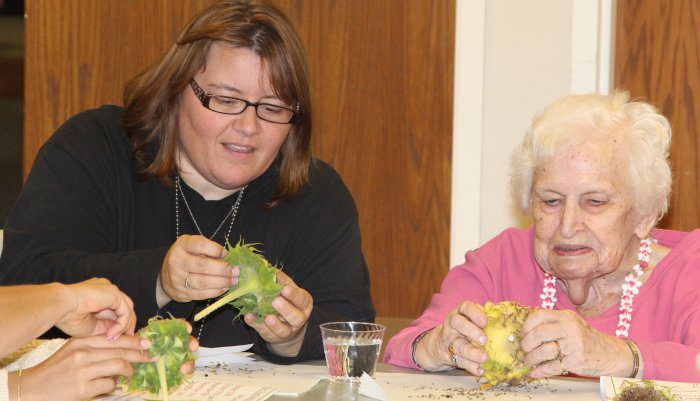 While Green Thumb Society was not an idea she came up with—the credit for that goes to a former groundskeeper at St. John’s Home—Holly has continued to run this program that has been a consistent part of the social calendar for over a decade. The group meets on the first and third Wednesday of each month and helps keep the gardens throughout St. John’s Home looking beautiful. “The society is meant to give elders who have always enjoyed gardening the chance to express that,” explains Holly. “It provides them the opportunity for digging in the dirt, planting, potting, and nurturing flowers.” Occasionally, special guests like Melanie Popick—a master gardener and former dietician at St. John’s Home—are able to provide additional insights into relevant topics.