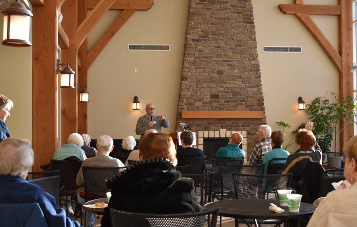 Paul Bartlett needed some help this morning. Recently approached to write an article about future trends in senior housing, he knew right where to go to get the answers he was looking for. During his first “Coffee with Paul” session of the year, he turned to the experts—the 40 or so residents who braved the cold to come to the Wintergarden at Brickstone by St. John’s—for input on what aspects of their senior housing experience are most important and what they would like to see in the coming years.