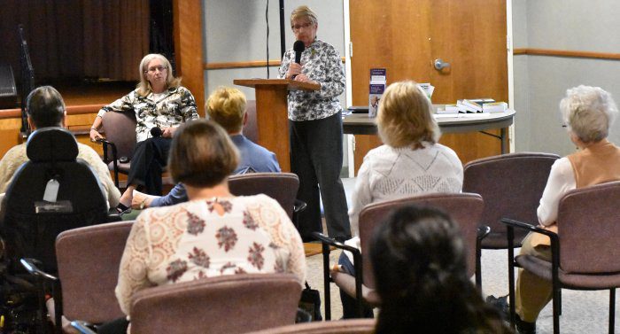 Ann Henderberg (standing) and Vicky Ruppert share their caregiving experience with audience at St. John’s Home