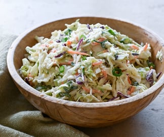 Whisk dressing ingredients together, adding olive oil last. Add dressing to shredded cabbage and carrot.