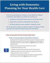 The NADRC created a series of consumer guides to help people living with dementia and their family members or other care partners know what to plan for and how to get started. The guides cover 4 topics: 1) health care planning; 2) financial planning; 3) care planning; and 4) supporting someone living with dementia in making decisions.