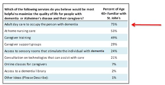 Of those respondents with dementia experience, certain services were identified as helpful in maximizing the quality of life for people with dementia and their caregivers. 75% of those respondents indicated that that adult day care was important. This top preferred service was followed by at-home nursing care and advocate caregiver training, with 53% and 49% of respondents, respectively identifying those services.
