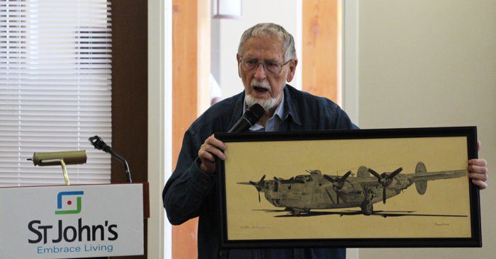 Jay Bourne is another resident who was in the air during WWII. He used a letter he received from a child after completing a recent Honor Flight Mission to help tell two harrowing tales from his time as a pilot with the U.S. Army Air Corps. He told those stories in detail, and cited his training and his diligent work familiarizing himself with the airplanes he flew as the reason he was able to walk away from every mission he flew in. “Our training had put us in as good of a position as possible—and I’m still alive.”