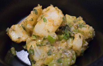 In large pot, cover unpeeled potatoes with water. Cover pot and bring to boil over high heat. Reduce heat to medium-low, keep covered, and simmer until tender, about 10-12 minutes. Remove from heat and drain water. Refill pot with cold water to allow potatoes to cool. Once cool cut potatoes into cubes. Place cubed potatoes in large bowl and toss gently with pickle, scallions, celery, herbs, vinegar, dill, paprika, and pepper.