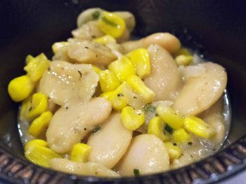 Sauté diced onion in hot oil in a large skillet over medium-high heat for 5 minutes. Stir in corn and honey; cook, stirring often; 6 minutes or until corn is tender. Stir in beans and ½ cup reserved cooking liquid; cook, stirring occasionally; 5 minutes. Stir in butter and add pepper to taste. Sprinkle with chives.
