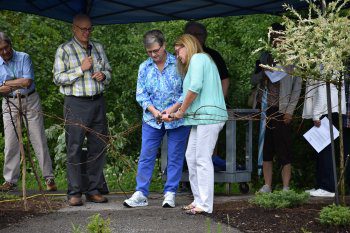 Since that day, both Art and Barb have unfortunately passed away. However, a living memorial inspired by their generosity and love of nature was unveiled this afternoon as a lasting tribute for others to enjoy for decades to come. Dozens of their fellow residents from St. John’s Meadows and Brickstone, staff members, and family members gathered to officially dedicate this beautiful new outdoor spot.