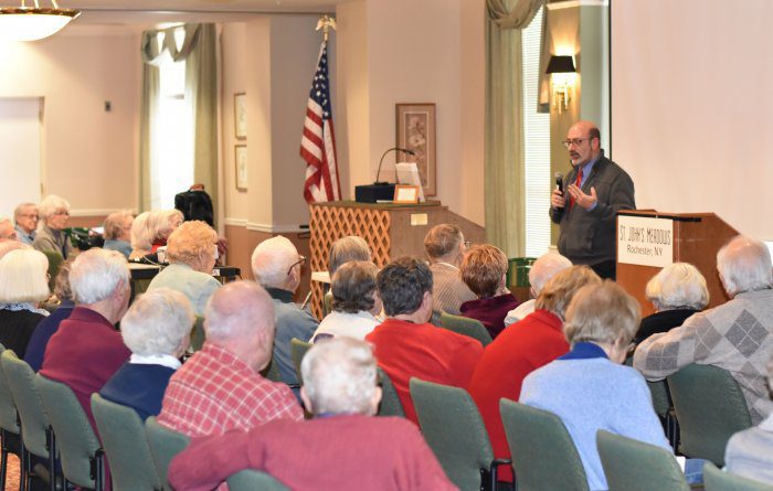 “You want to choose somebody who knows your wishes, understands how you make decisions, and also understands your value system.” This advice on choosing a health care agent from Dr. Daniel Mendelson was one of many takeaways from his presentation at St. John’s Meadows on February 7. An audience of over three dozen residents (including Gene Mendelson, his proud father), employees, and guests attended Dr. Mendelson’s discussion, the first session of this year’s “Writing Your Final Chapter” series at St. John’s.