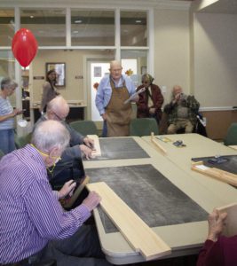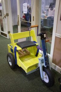 Over these past two years he has lived in a cottage at St. John’s Meadows and steadily helped the P.E.T. Project, even while recovering from a medical procedure. He recently brought his passion to other residents and implored their help. A group of about ten residents gathered together to help Harold sand several of his pieces from the woodshop. He had a mobility cart on display to show everyone what their contributions will become. Listening to Harold tell the residents about the organization and how many people they help each year is truly inspiring. Since bringing awareness of this need, Harold has recruited several residents who agreed to consistently help him sand pieces. Harold’s ultimate goal for the woodshop is to use it for multiple community service projects. “The majority of the organization is people like me who are retired and donate their time.”