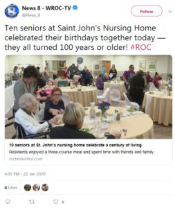 St. John’s has hosted this celebration of residents who have eclipsed the century mark for several years now. To see WROC-TV’s coverage of the 2020 Centenarian Luncheon, click here.