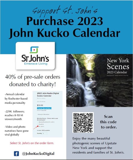Rochester, NY–St. John’s is one of only two charities (Foodlink is the other) that will receive proceeds from the pre-sales of the 2023 New York Scenes Calendar as announced by John Kucko, local regional media personality, via his Facebook page @JohnKuckoDigital on Saturday, June 18. Pre-sales officially opened following the social media announcement and supporters of St. John’s are directed to the online order page, where a selection can be made to direct proceeds to St. John’s.